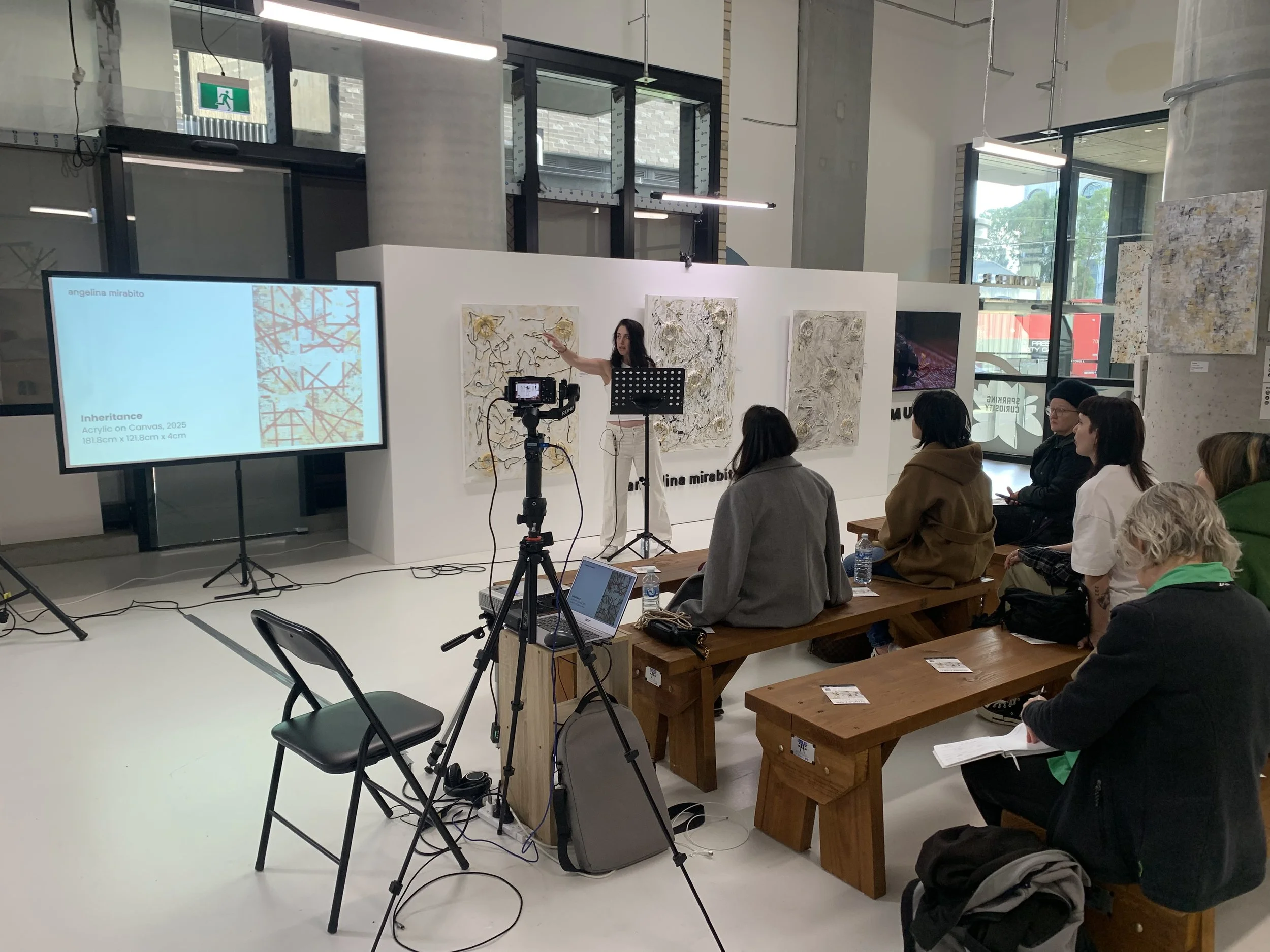 Mirabito is the ongoing artist in residence at Romulus Folio Gallery at The Gladstone since April 2025, supported by The Gladstone and FB Ideas, and is represented non-exclusively by Le Grange Gallery.