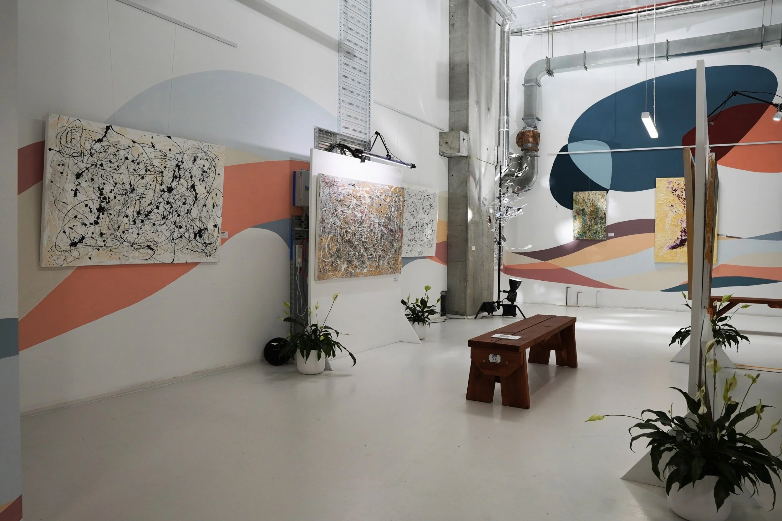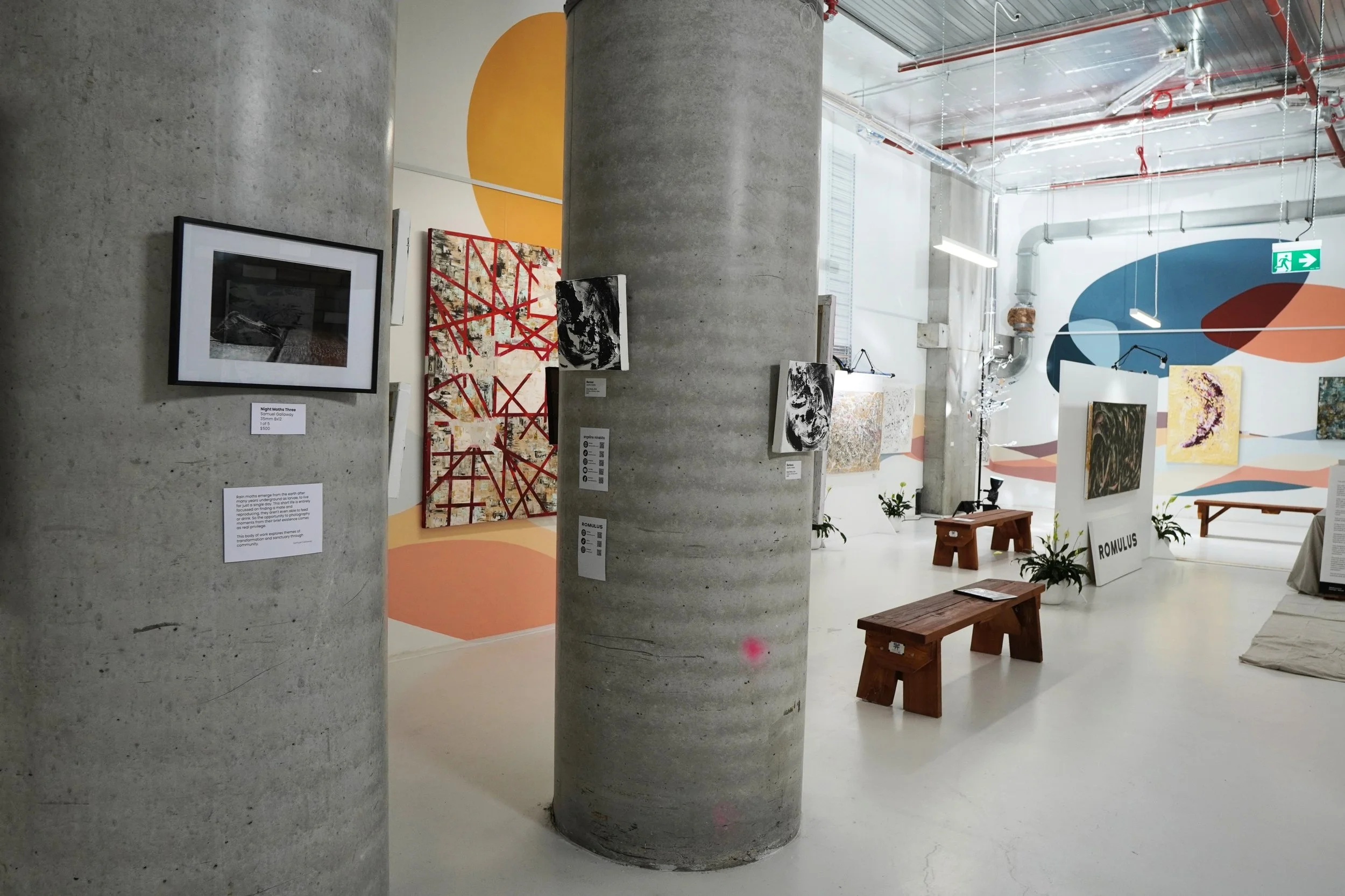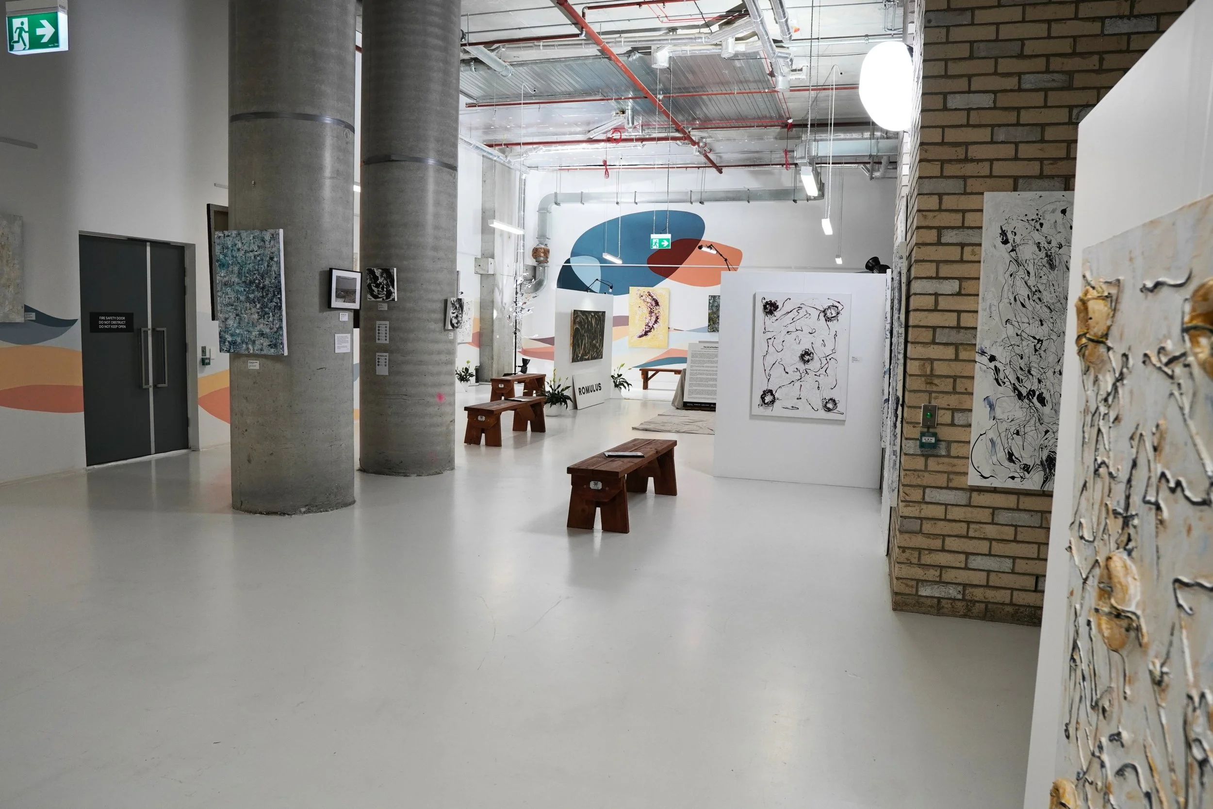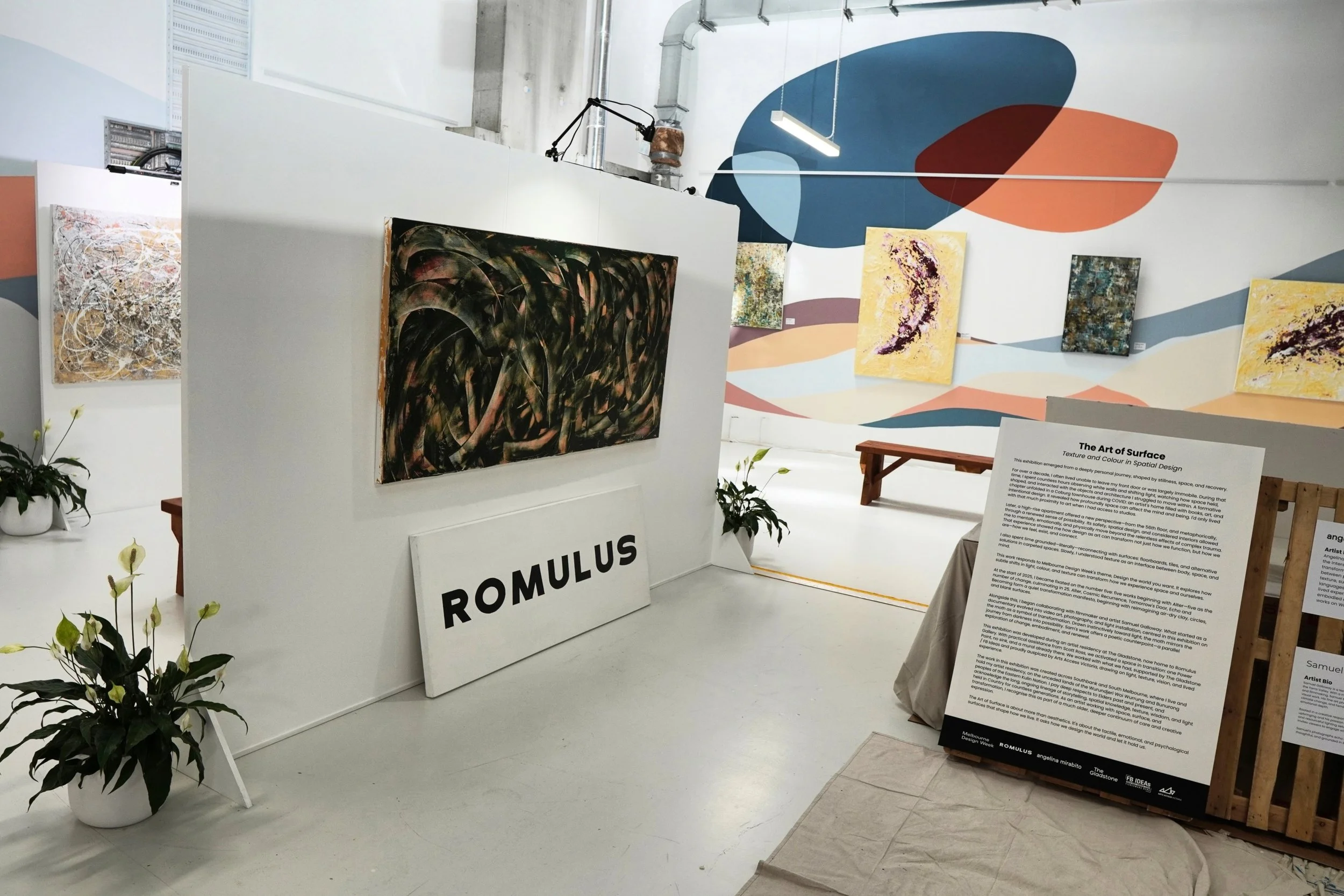 This exhibition was developed during an artist residency at The Gladstone, now home to Romulus Gallery. With practical assistance from Scott Ross, we activated a space in transition: one Power Point, no sink, and a mural already there. We worked with what we had, supported by The Gladstone / FB Ideas and proudly auspiced by Arts Access Victoria, drawing on light, texture, vision, and lived experience.