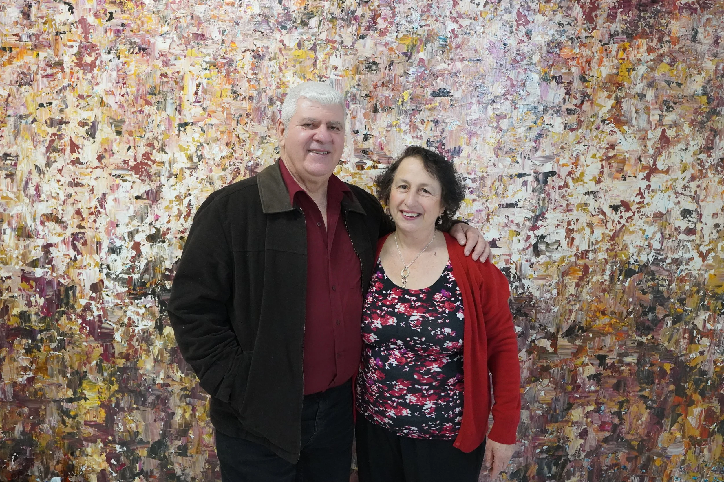 Ray Mirabito & Connie Mirabito in front of impact wall titled ‘Wildfire’