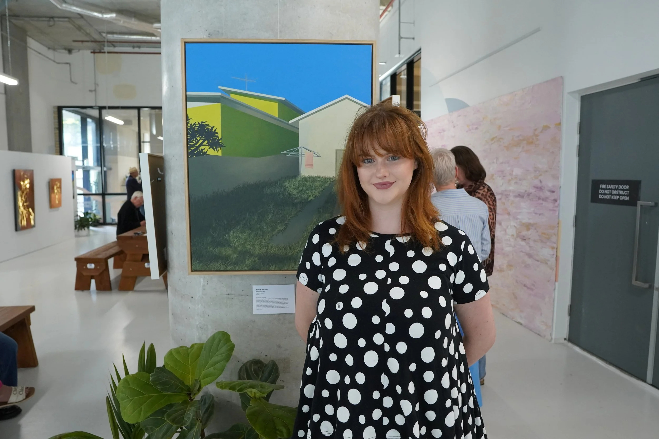 Ellen Jury, a Melbourne-based artist, contributes Beach Houses (2025) that commands our attention through her acute detail and precision, to observe, with her, a single pink towel hanging on a clothesline in a backyard. Her paintings, often drawn from spontaneous photographs, capture banal or transitional spaces, evoking both familiarity and a quiet, haunting stillness.